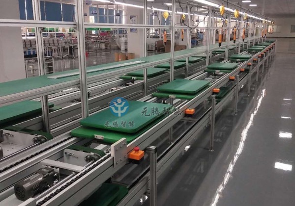 倍速链输送线是采用特制铝合金型材作导轨,用倍速链拖牵工装板作为输送介质,工装板可以传送,阻挡器控制工装板运动或停止,线体二端设有顶升平移机或升降机,使整个流程达到自动循环工作状态。流水线采用组合式装配模式,工位数及长度可按工艺要求设定。工位配置有脚踏开关、电源插座、工位阻挡器、工艺图板、照明、顶升旋转台等。